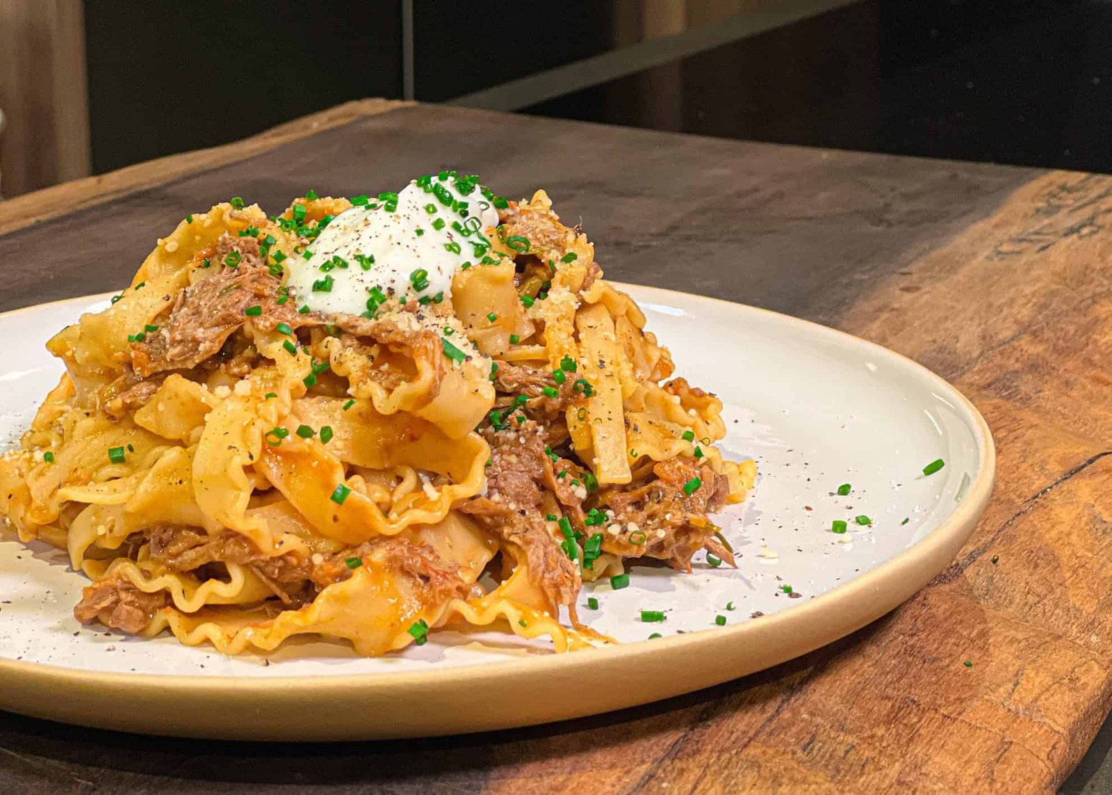 Μόλις τα ζυμαρικά είναι έτοιμα, κρατάμε 1 κούπα από τα υγρά, τα σουρώνουμε και τα προσθέτουμε μέσα στη κατσαρόλα με το ραγού μαζί με με τη 1/2 κούπα από τα υγρά και τη παρμεζάνα. Αν χρειαστεί προσθέτουμε έξτρα υγρά αλλά αυτό εξαρτάται από το πόσα υγρά έχουν μείνει στο κρέας.
