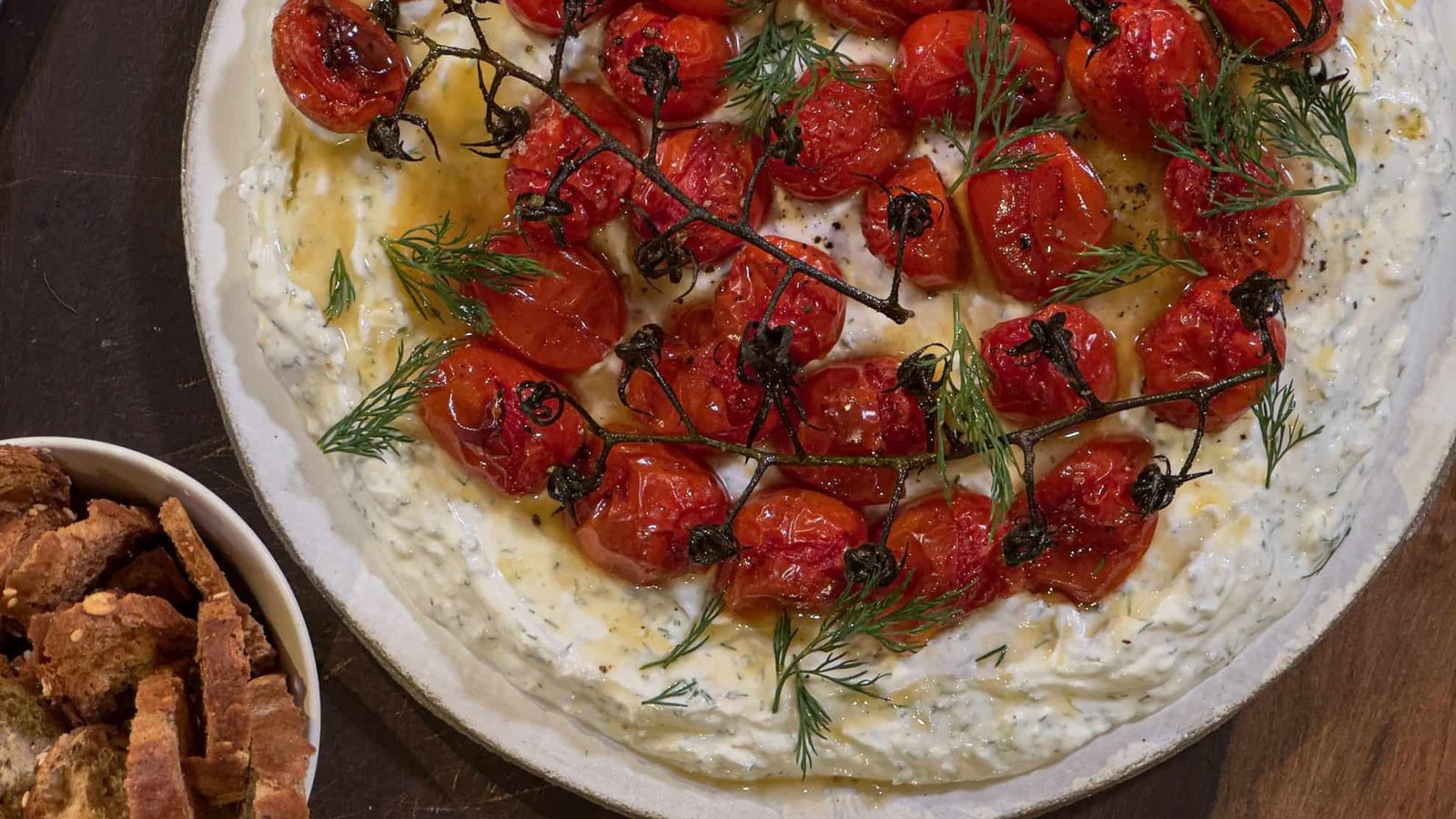 Για το ντιπ γιαουρτιου με ψητα τοματινια και τραγανα ψωμακια ολικης