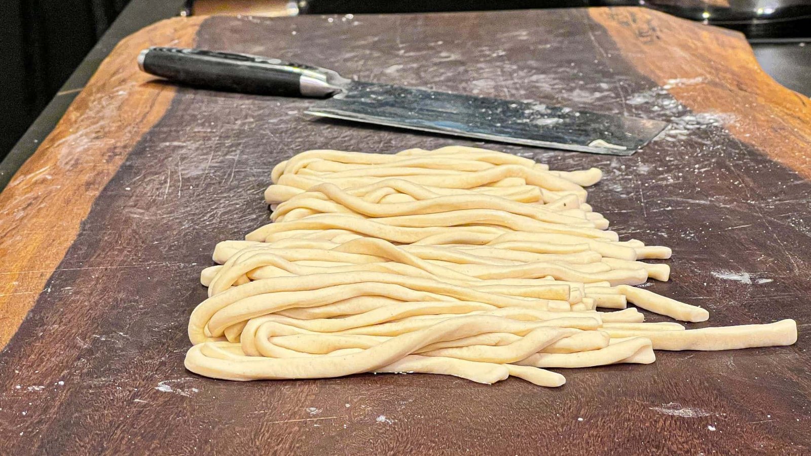 Μεταφέρουμε τη ζύμη σε μία καθαρή επιφάνεια εργασίας αφού έχουμε πασπαλίσει με το άμυλο πατάτας και στη συνέχεια την ανοίγουμε με τη βοήθεια ενός πλάστη σε διάσταση 35Χ25. Πασπαλίζουμε με έξτρα άμυλο διπλώνουμε στη μέση και με ένα μαχαίρι κόβουμε τα udon noodles περίπου στα 0.5cm. Πασπαλίζουμε με έξτρα άμυλο και σιγουρευόμαστε ότι δεν έχουν κολλήσει μεταξύ τους. Εναλλακτικά μπορούμε να χρησιμοποιήσουμε corn flour