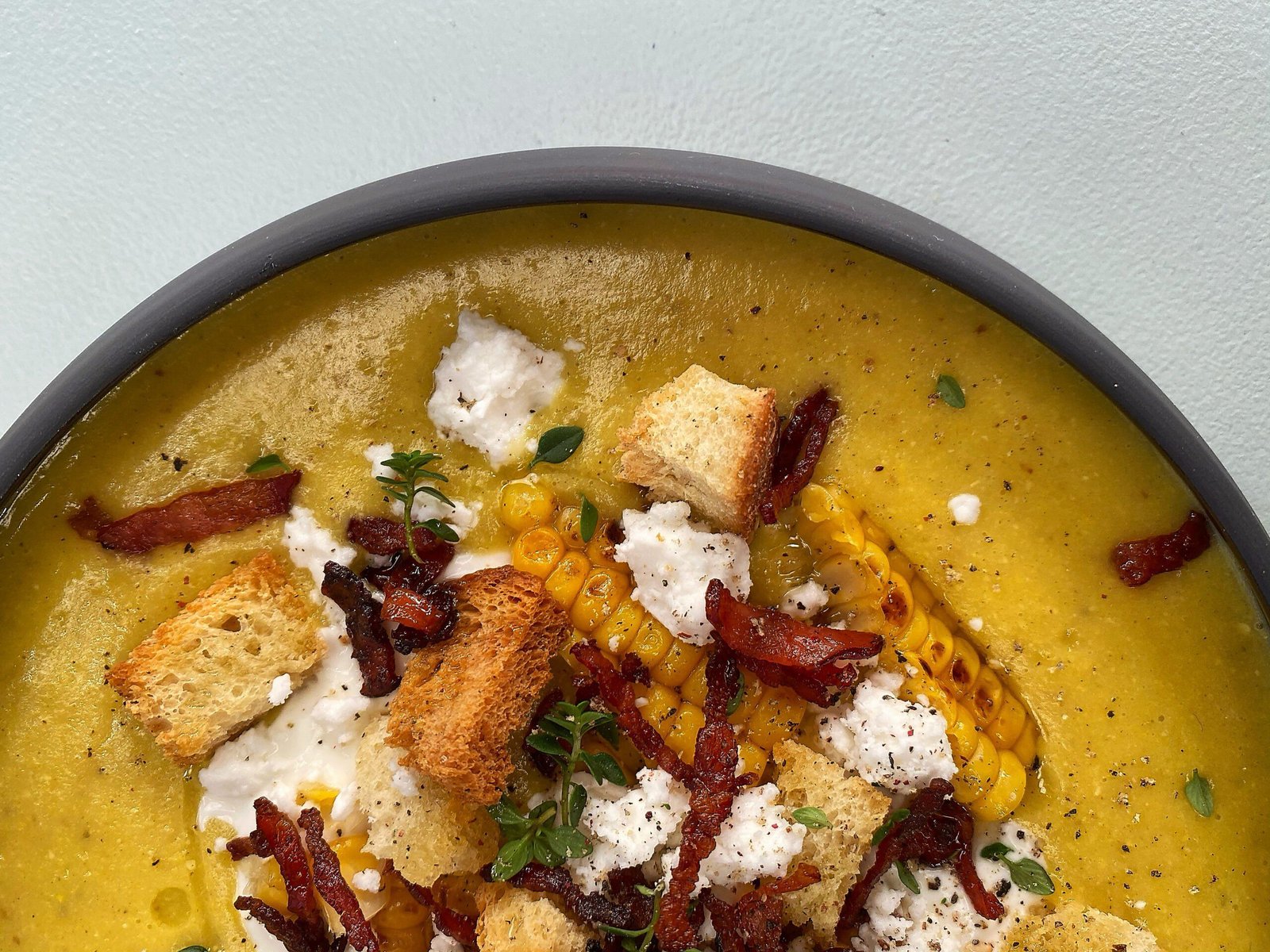 2. Ιδανικά φρυγανίζουμε ελαφρώς το ψωμί, το αλείφουμε με το κατσικίσιο τυρί (ή το κατίκι) και τέλος προσθέτουμε τα καραμελωμένα κρεμμύδια και το φρέσκο θυμάρι.